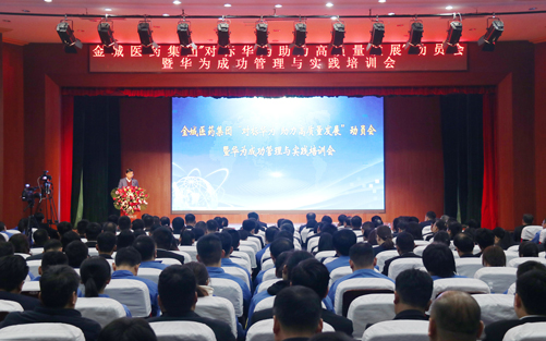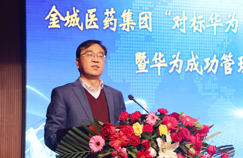 金城醫(yī)藥集團(tuán)董事長趙葉青分別從“會(huì)議目的、為什么對(duì)標(biāo)華為、對(duì)標(biāo)華為學(xué)什么、如何對(duì)標(biāo)學(xué)習(xí)、追求什么學(xué)習(xí)效果”五個(gè)方面作了動(dòng)員講話。
