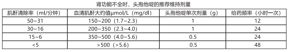 對于嚴(yán)重感染的病人,特別是中性粒細(xì)胞減少癥的患者,一般每天接受6g的頭孢他啶的劑量,但不能用于腎功能不全的病人.以上表格所列的單次劑量可以增加50%或適當(dāng)增加給藥頻率。對這些病人,建議監(jiān)測頭抱他臉的血清濃度,而谷濃度