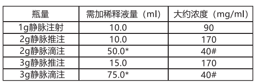給藥方法:頭孢他啶可靜脈給藥或深部肌肉注射給藥,如臀大肌之上夕HM四分之一或大腿的外側(cè)部位.調(diào)制指導(dǎo):需加稀釋液量及溶液濃度見下表,需要采用部分劑量時(shí),該表可能有用.