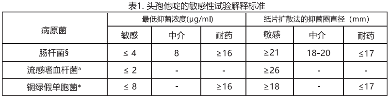 腸桿菌的敏感性解釋標(biāo)準(zhǔn)是基于每8小時(shí)1g劑量而得出.對于中介敏感的分離菌株,腎功能正常患者每8小時(shí)給藥劑量2g. *銅綠假單胞菌敏感性解釋標(biāo)準(zhǔn)是基于腎功能正常的患者每8小時(shí)靜注2g劑量而得出的.目前不存在除"敏感"類別以外 的耐藥菌株信息,不能定義除"敏感"外的類別.如果測出除敏感之外的MIC結(jié)果,則應(yīng)將其提交至參考實(shí)驗(yàn)室進(jìn)行附加試驗(yàn).葡萄球菌對頭抱他。定的敏感性可能從僅對青霉素和頭抱西丁或苯理西林的測試中推導(dǎo)出來的。藥敏報(bào)告"敏感"表示,抗菌藥 物在感染部位通常達(dá)到的濃度很可能會抑制病原菌生長.報(bào)告"中介"表示,該結(jié)果是不明確的,如果微生物對可替換的臨床可行藥物不完全敏感,則應(yīng)重復(fù)進(jìn)行該測試.這個(gè)分類意味著在藥物生理性聚集的身體部位或在能使用高劑量的情況下可能具有臨 床適用性.這個(gè)分類還能提供一個(gè)緩沖區(qū)間來防止小的、不受控制的技術(shù)因素導(dǎo)致的解釋差異.報(bào)告"耐藥"表示抗菌藥物在感染部位通常達(dá)到的濃度很可能不能抑制病原菌的生長,應(yīng)該采取其他的治療方法.