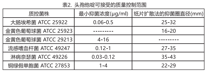質(zhì)量控制標(biāo)準(zhǔn)化藥敏試驗(yàn)方法需采用實(shí)驗(yàn)室對照品,以便監(jiān)測和確保藥敏試驗(yàn)中所用樣品和試劑以及試驗(yàn)操作人員技術(shù)的準(zhǔn)確度和精確度.頭袍他碇標(biāo)準(zhǔn)粉末應(yīng)提供表2中的MIC值范圍.對于使用30Pg頭孢他啶紙片進(jìn)行的擴(kuò)散法應(yīng)符合表2中的標(biāo)準(zhǔn).